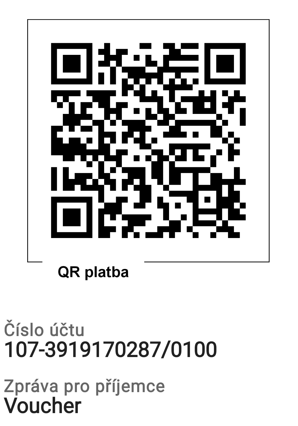 Při platbě QR kódem nebo převodem, doplňte celkovou částku. Do poznámky plátce zadejte jméno a příjmení objednavatele.